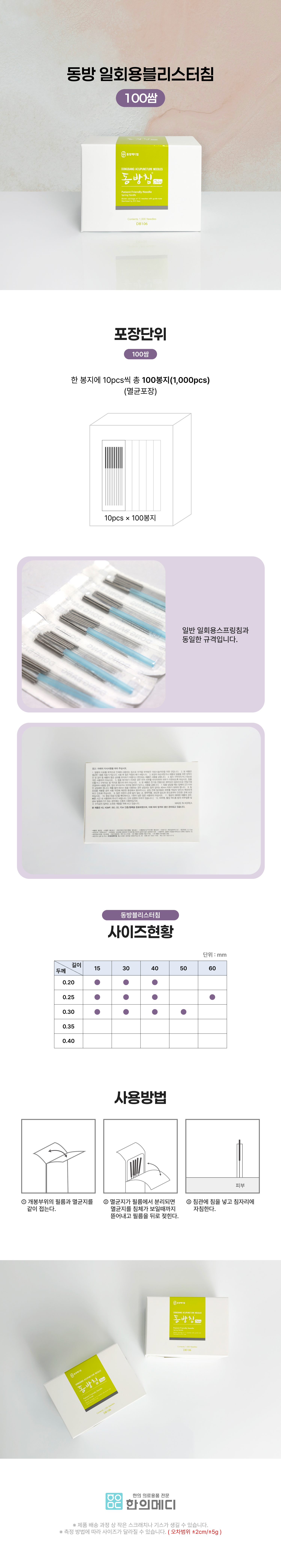 | 제품의 사용목적 및 사용방법 | 질병의 치료를 목적으로 인체에 사용하는 침 |